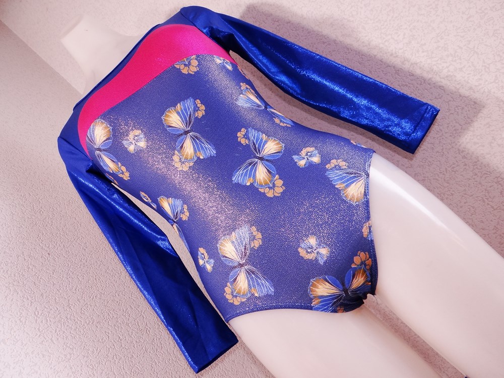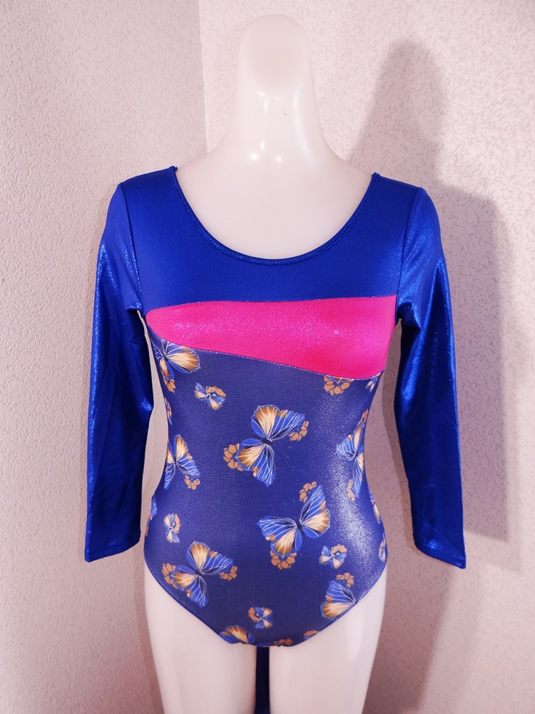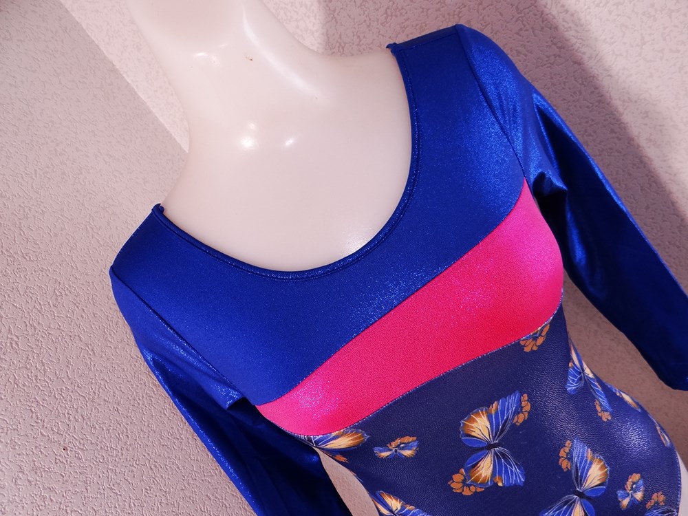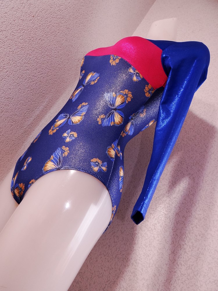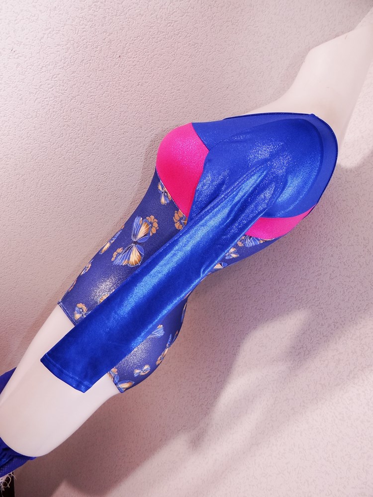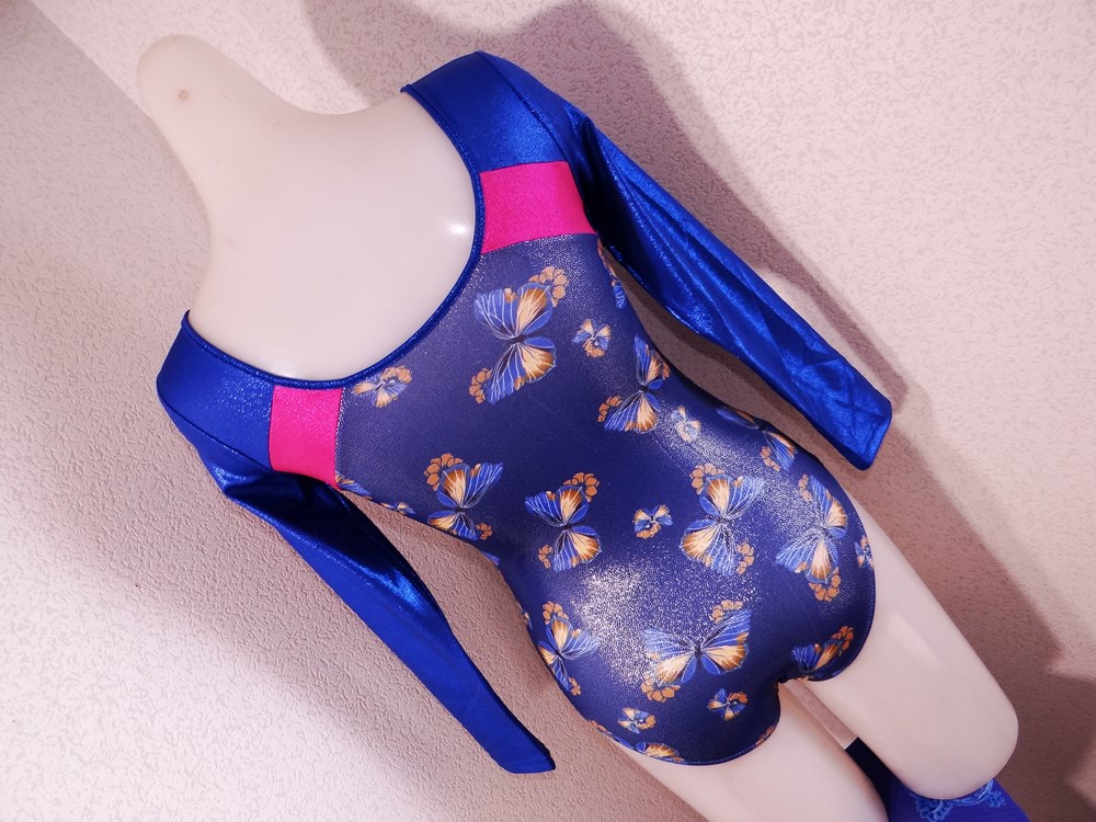 (使用者年齢:18歳-高校生:新体操部でご使用の光沢系ピカピカの競技用レオタードの使用済み品です。)