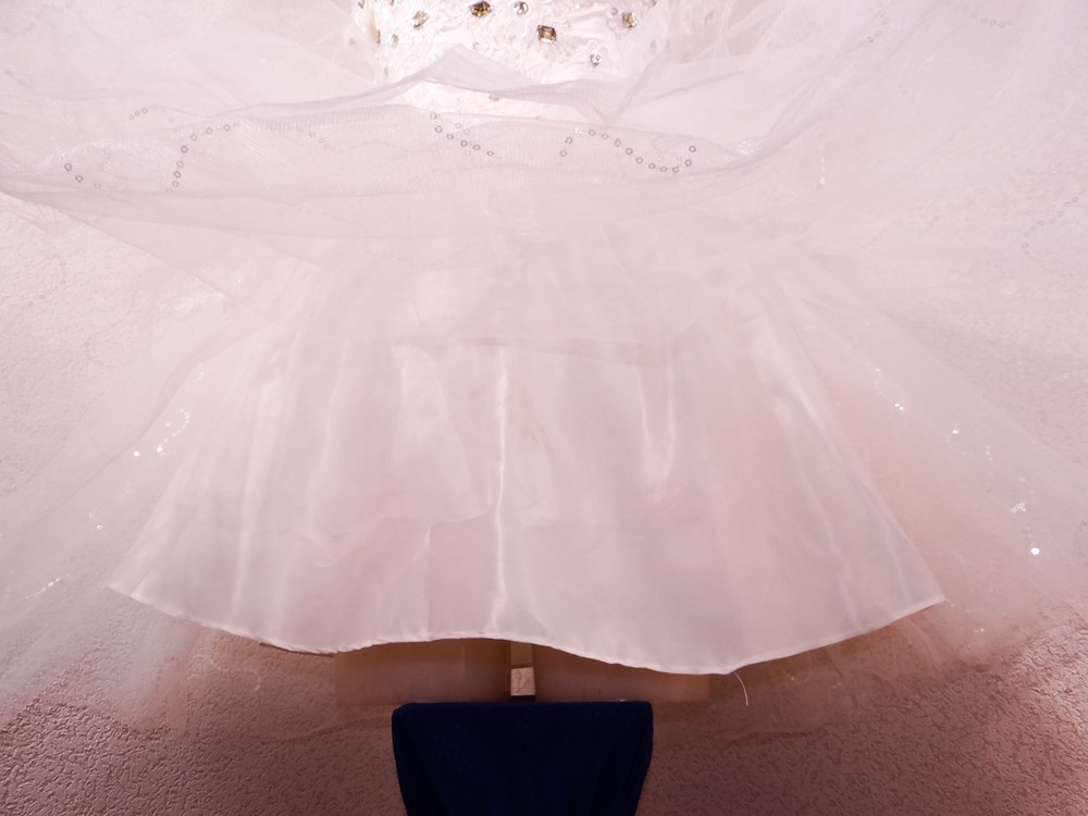 (オーダーメイド12万円ドレス:ボリュームの有るスカート部は5重層:アンダー下着と白パンストセット:使用者年齢帯:20代前半:関西のアイドル活動でご使用された再生品です。)